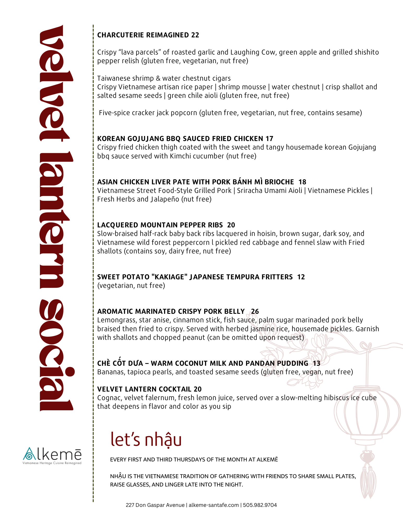 The Velvet Lantern Social (VLS) is Alkemē’s twice-monthly dining experience, held on the 1st and 3rd Thursdays of each month. Inspired by the Vietnamese tradition of nhậu, these evenings are festive and social, with food designed for sharing and connection. Guests are welcome to join by reservation or walk-in and may be seated at communal tables.