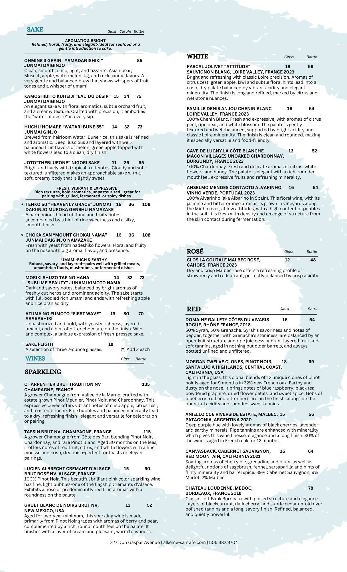 The à la carte menu is available nightly and is designed for sharing, allowing guests to shape their own experience at the table. A limited selection of à la carte items is available to-go daily from 5:00–8:00 PM. To place an order, please call (505) 982-9704.