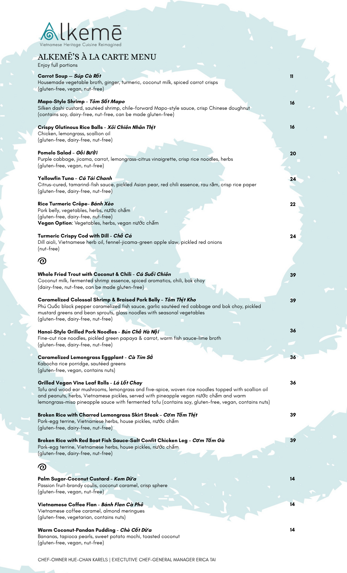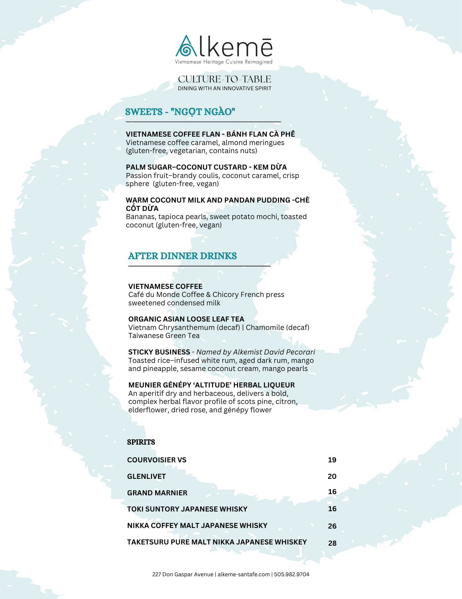 Desserts at Alkemē reflect a Vietnamese approach to sweetness—one that favors fruit, gentle sweetness, and texture over richness. These dishes invite guests to experience familiar ingredients in new ways, offering flavors and textures that feel light, balanced, and true to the spirit of the kitchen.