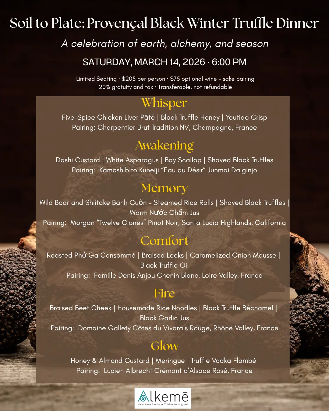 Alkemē’s Soil to Plate: Provençal Black Winter Truffle Dinner 3/14/26